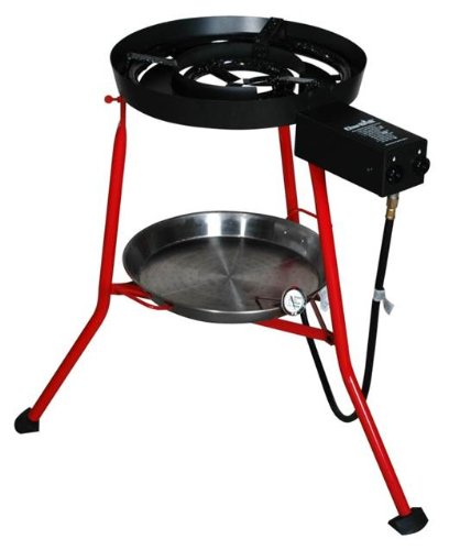 The Char-Broil multi-purpose cooker is perfect for tailgating or camping. It requires no tools for assembly and is easy to transport. Two independently-controlled burner rings eliminate cold spots and increase cooking options. Features include 30,000 BTU porcelain-coated steel tube burner system and a sturdy tripod base which supports pans up to 22 inch. It includes a 17inch stainless steel paella